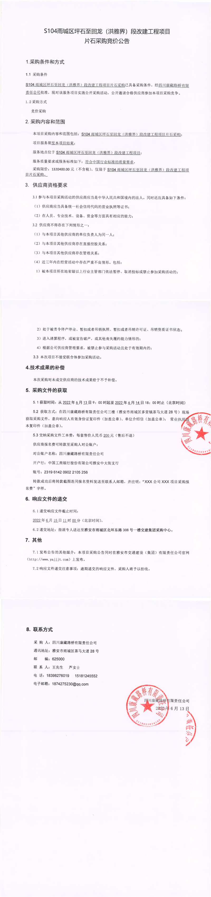 四川康藏路桥有限责任公司S104雨城区坪石至回龙(洪雅界)段改建工程项目片石采购竞价公告