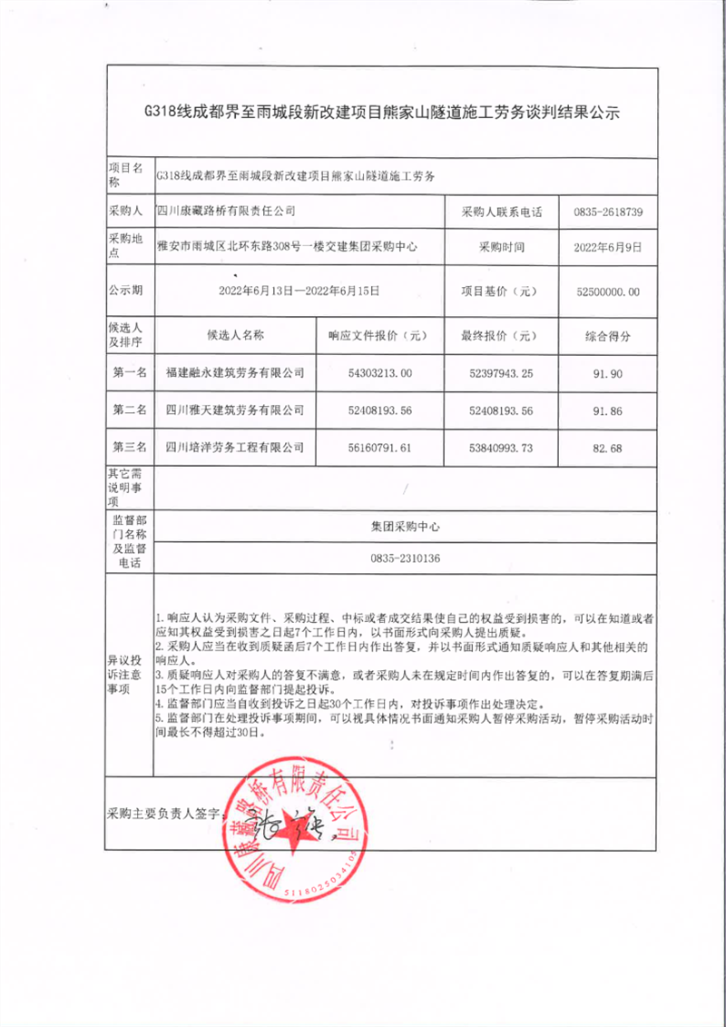 四川康藏路桥有限责任公司G318线成都界至雨城段新改建项目熊家山隧道施工劳务谈判结果公示