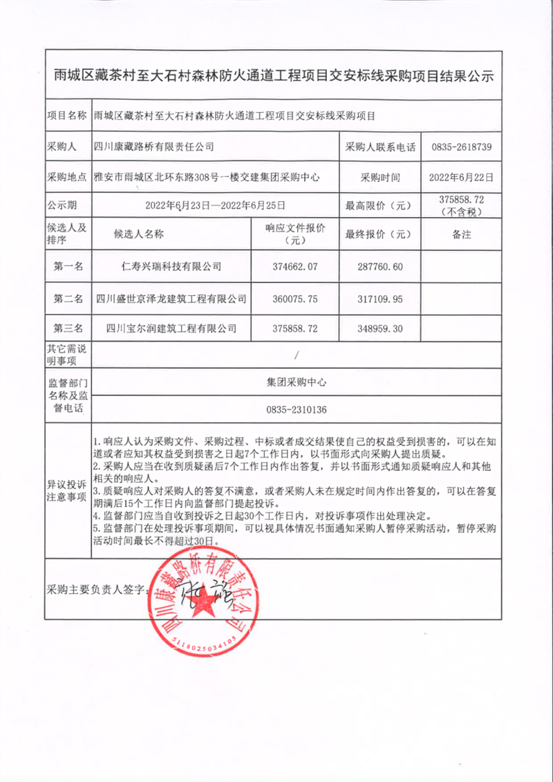 四川康藏路桥有限责任公司雨城区藏茶村至大石村森林防火通道工程项目交安标线采购项目结果公示