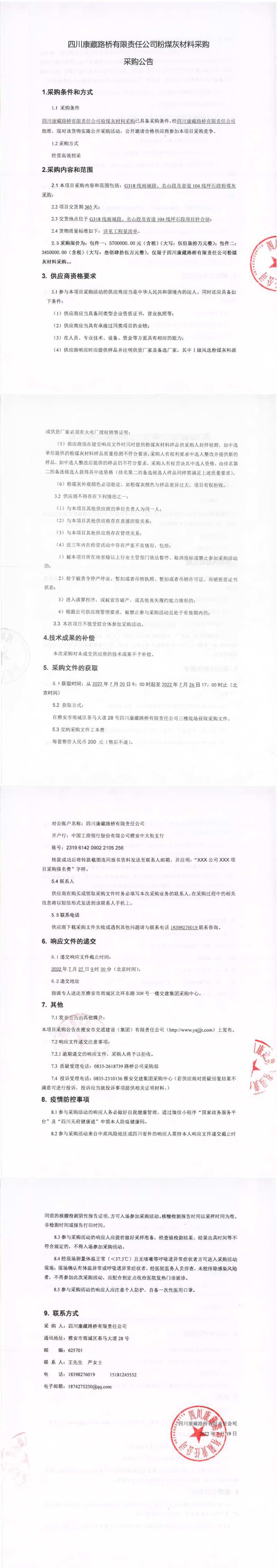 四川康藏路桥有限责任公司粉煤灰材料采购采购公告