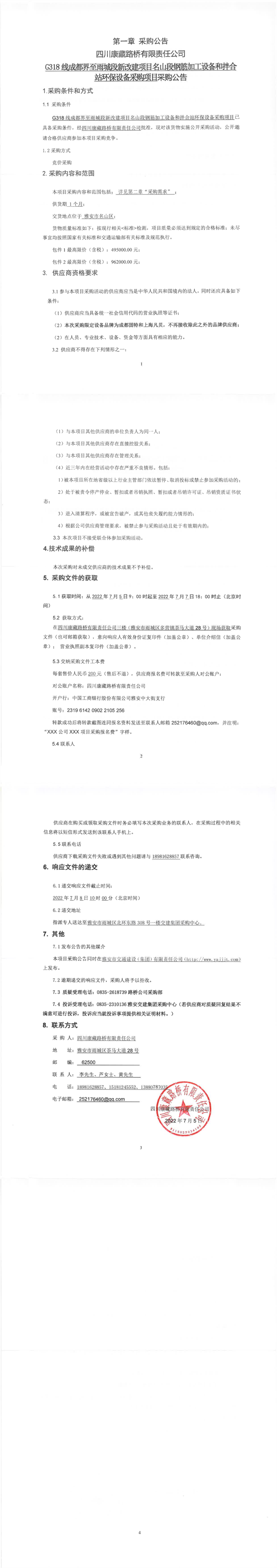 四川康藏路桥有限责任公司G318线成都界至雨城段新改建项目名山段钢筋加工设备和拌合站环保设备采购项目采购公告