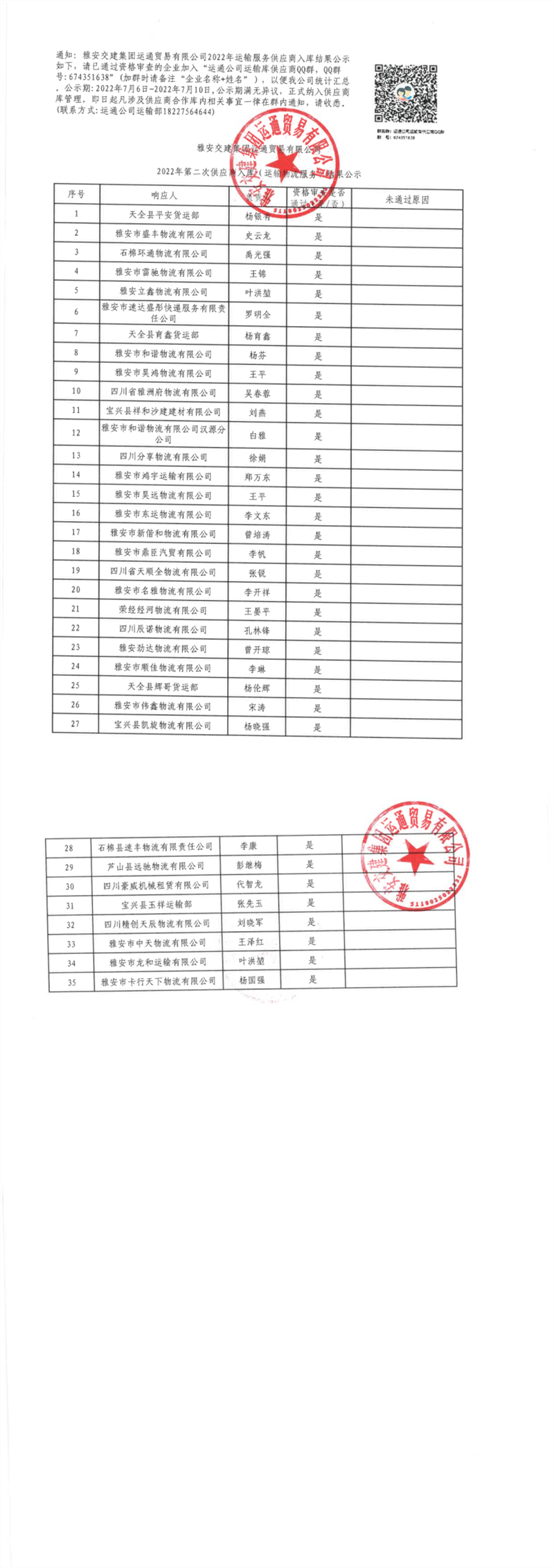 威廉希尔集团运通贸易有限公司2022年第二次供应商入库(运输物流服务)结果公示