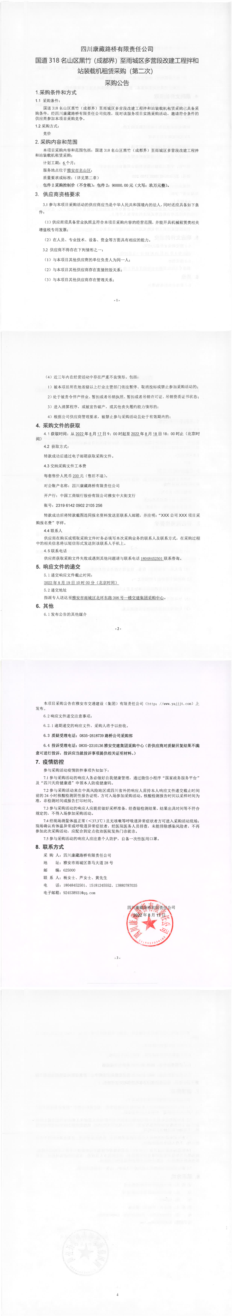 四川康藏路桥有限责任公司国道318名山区黑竹(成都界)至雨城区多营段改建工程拌和站装载机租赁(包件1)结果公示