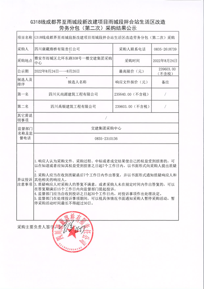 四川康藏路桥有限责任公司G318线成都界至雨城段新改建项目雨城段拌合站生活区改造劳务分包(第二次)采购结果公示