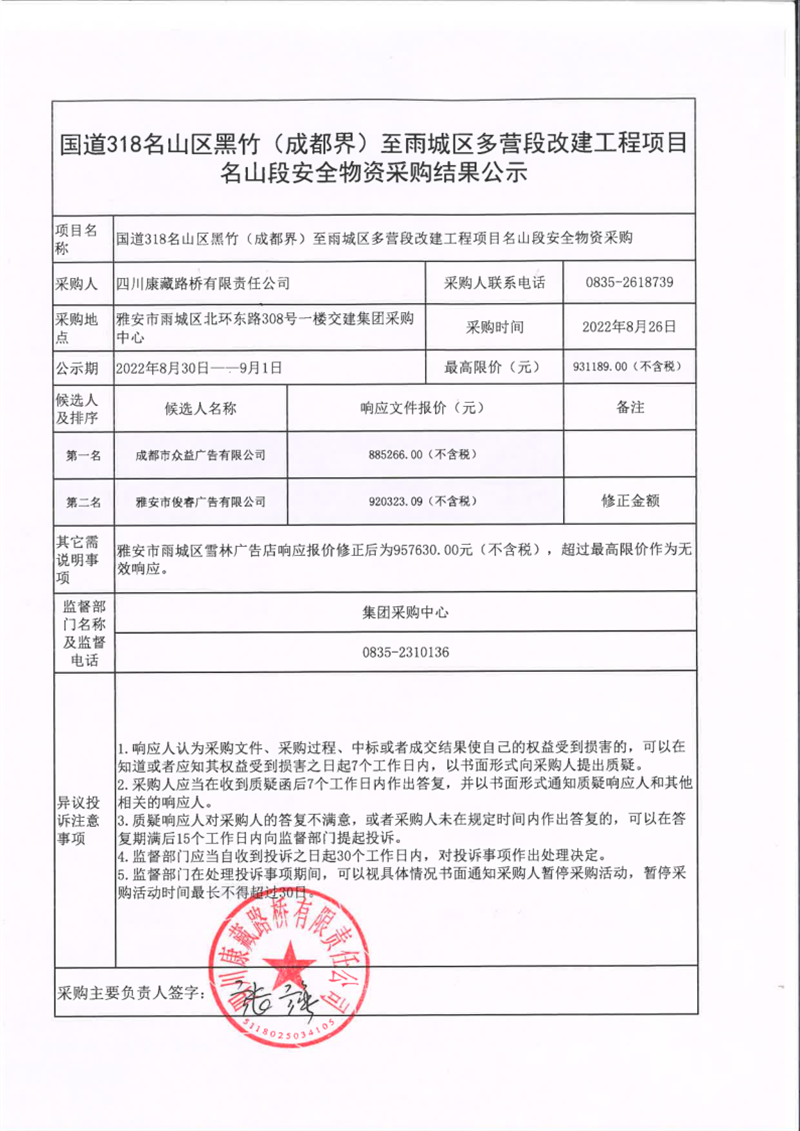 四川康藏路桥有限责任公司国道318名山区黑竹(成都界)至雨城区多营段改建工程项目名山段安全物资采购结果公示