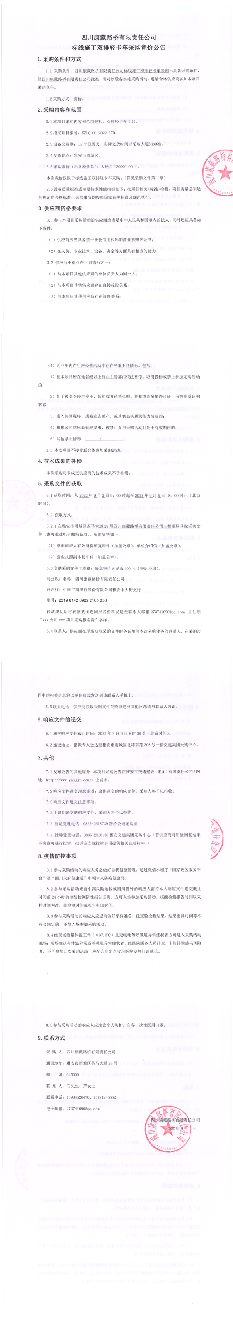 四川康藏路桥有限责任公司标线施工双排轻卡车采购竞价公告