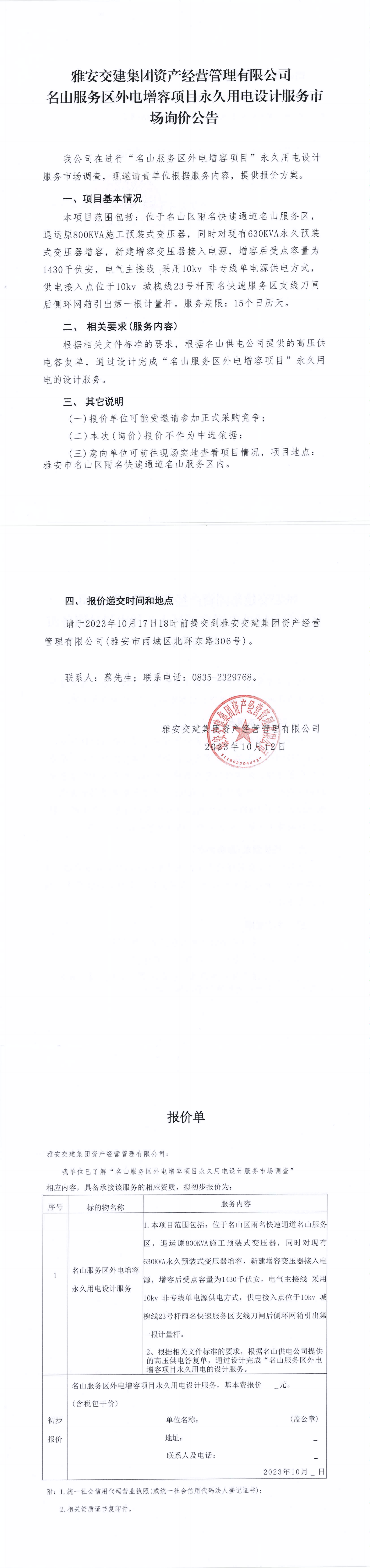威廉希尔集团资产经营管理有限公司名山服务区外电增容项目永久用电设计服务市场询价公告