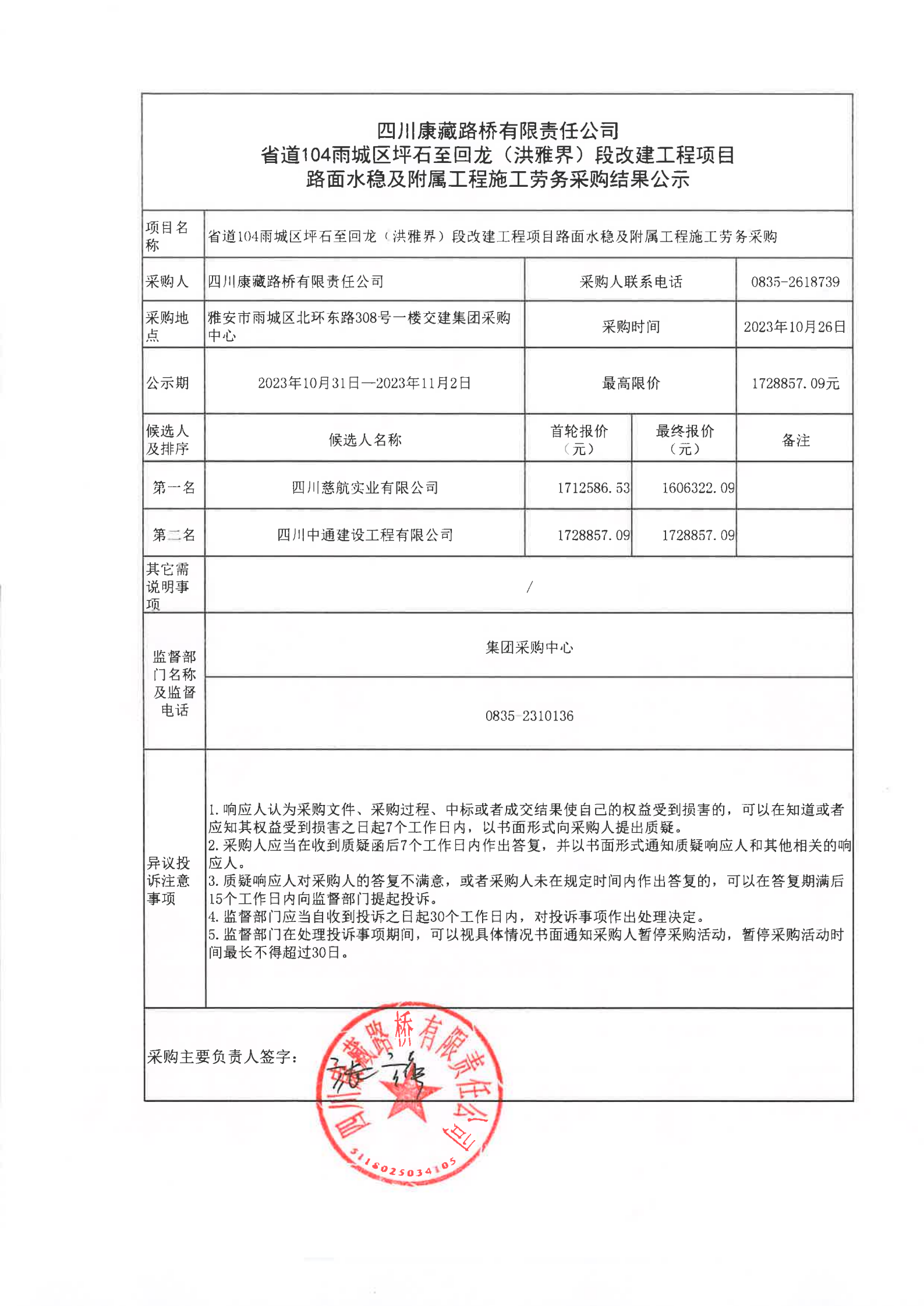 四川康藏路桥有限责任公司省道104雨城区坪石至回龙(洪雅界)段改建工程项目路面水稳及附属工程施工劳务采购结果公示
