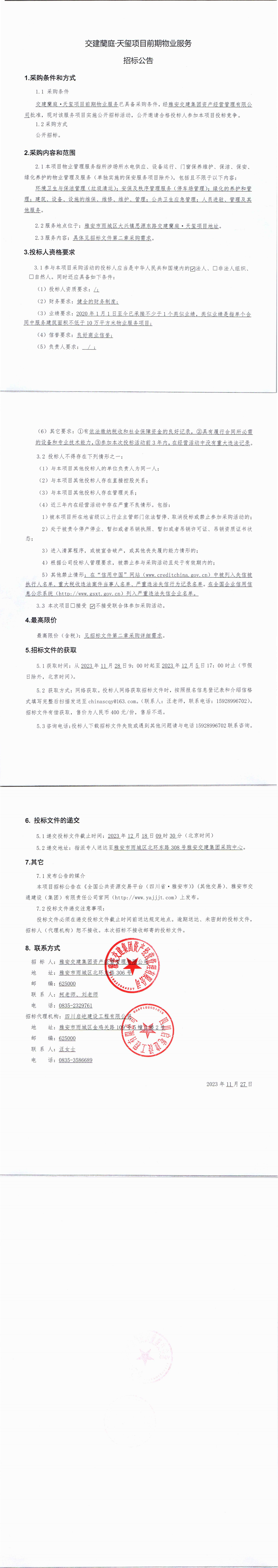 威廉希尔集团资产经营管理有限公司交建蘭庭·天玺项现在期物业服务招标公告