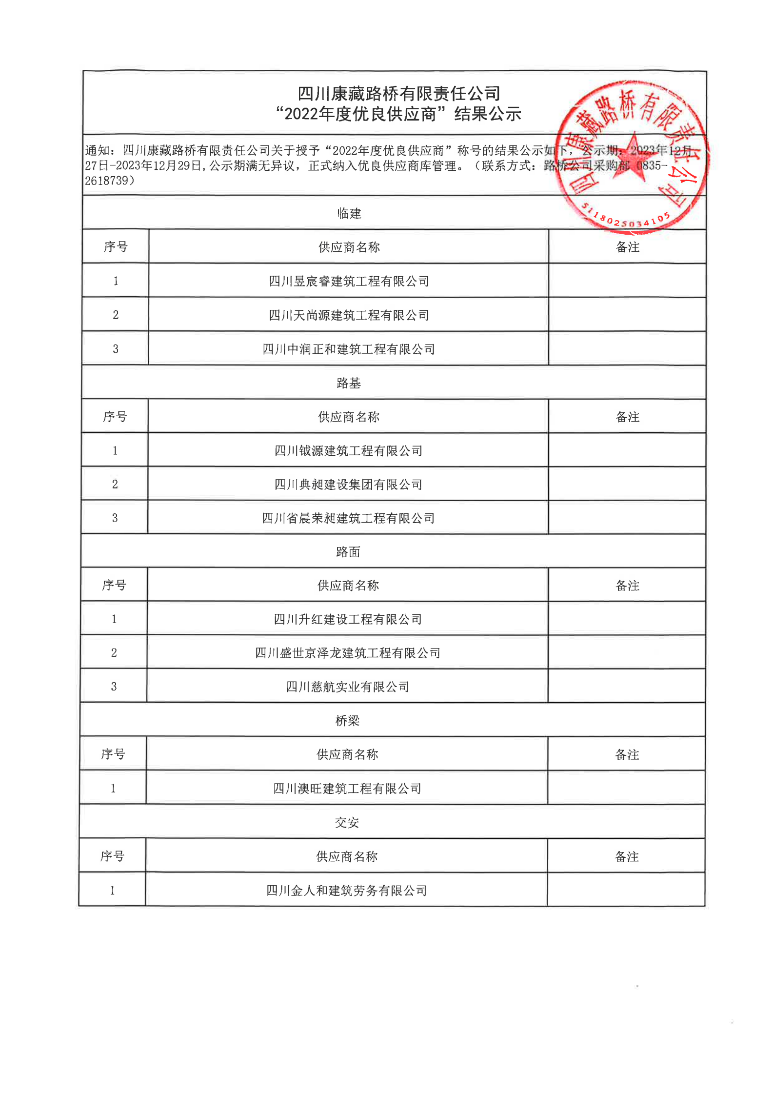 四川康藏路桥有限责任公司“2022年度优良供应商”结果公示