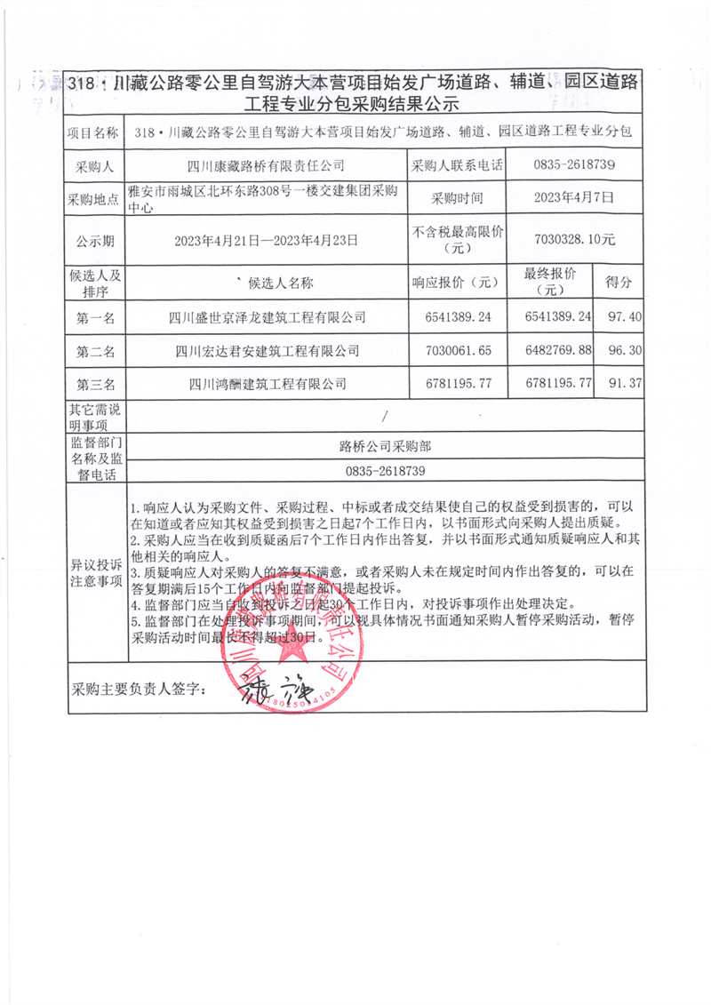 四川康藏路桥有限责任公司318·川藏公路零公里自驾游大本营项目始发广场道路、辅道、园区道路工程专业分包采购结果公示