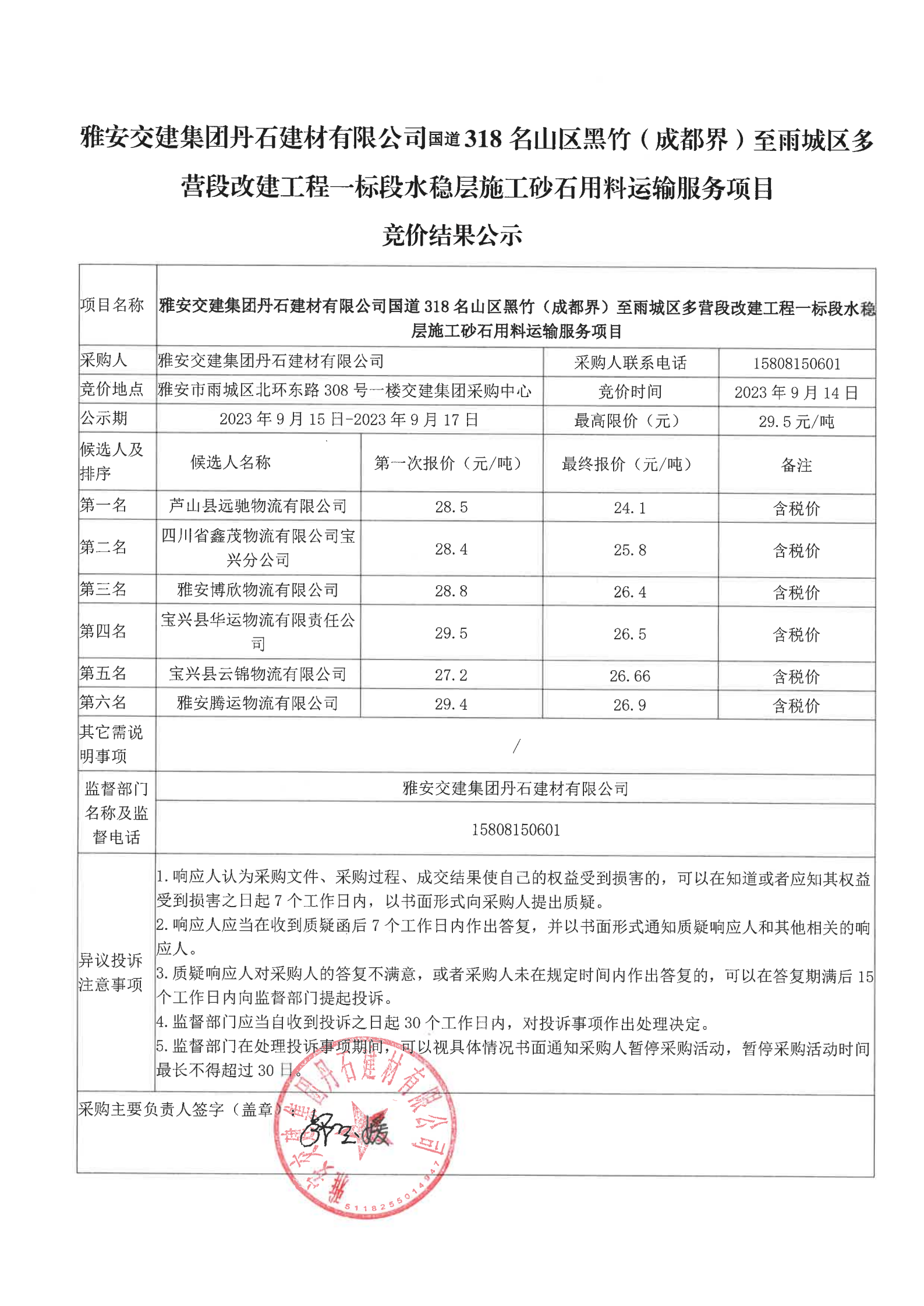 威廉希尔集团丹石建材有限公司国道318名山区黑竹(成都界)至雨城区多营段改建工程一标段水稳层施工砂石用料运输服务项目竞价结果公示