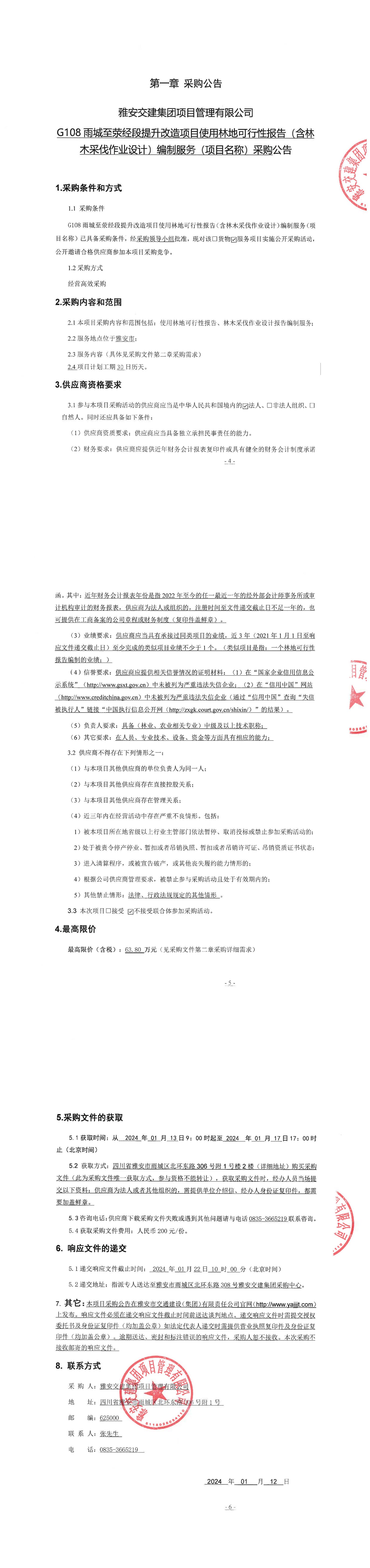威廉希尔集团项目管理有限公司G108雨城至荥经段提升改造项目使用林地可行性报告(含林木采伐作业设计)编制服务(项目名称)采购公告