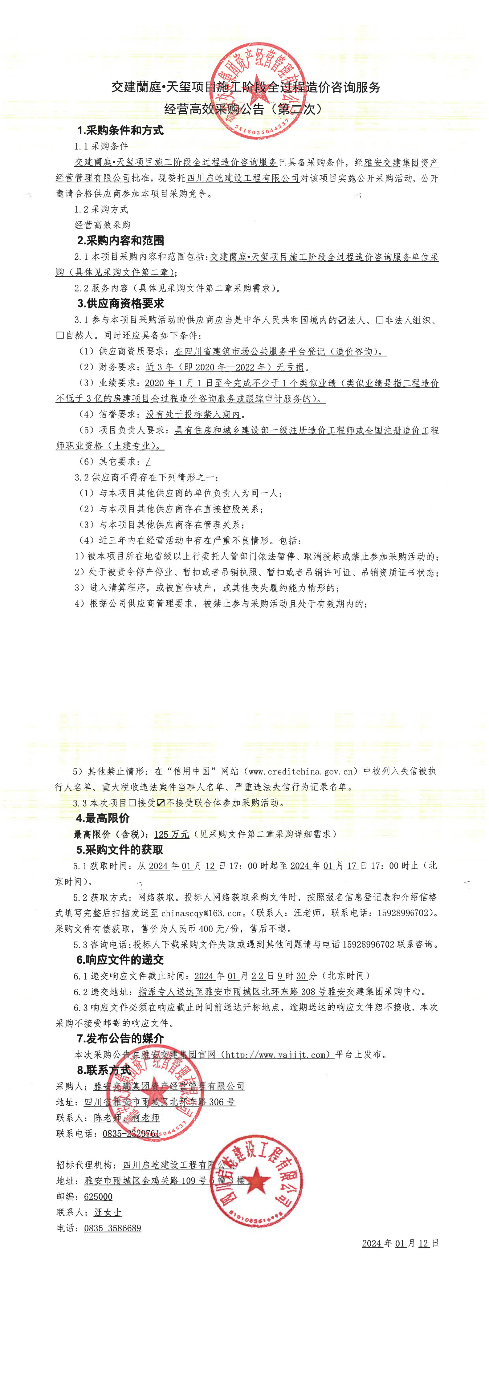 威廉希尔集团资产经营管理有限公司交建蘭庭·天玺项目施工阶段全过程造价咨询服务经营高效采购公告(第二次)