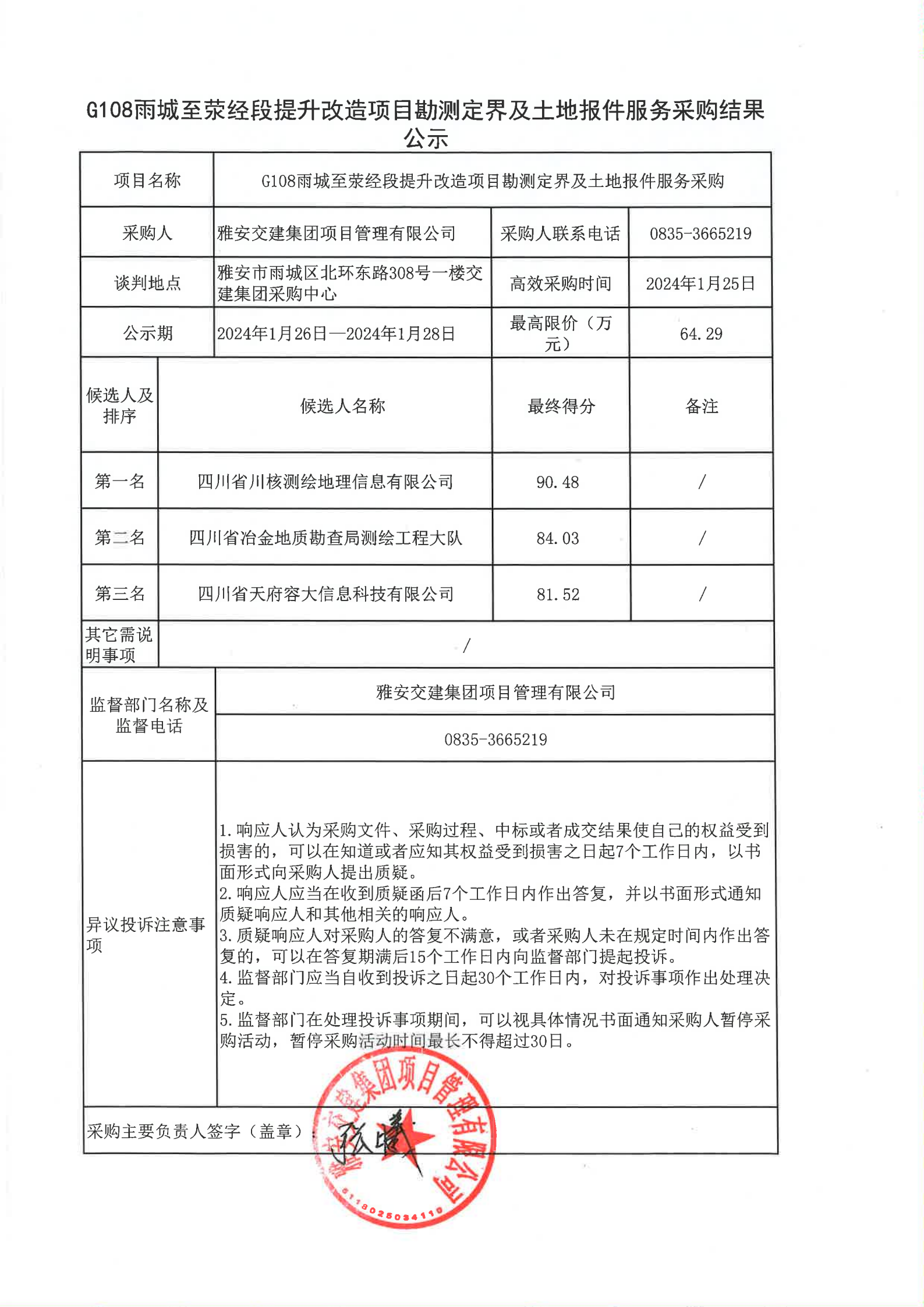 四川康藏路桥有限责任公司G108雨城至荥经段提升改造项目勘测定界及土地报件服务采购结果公示