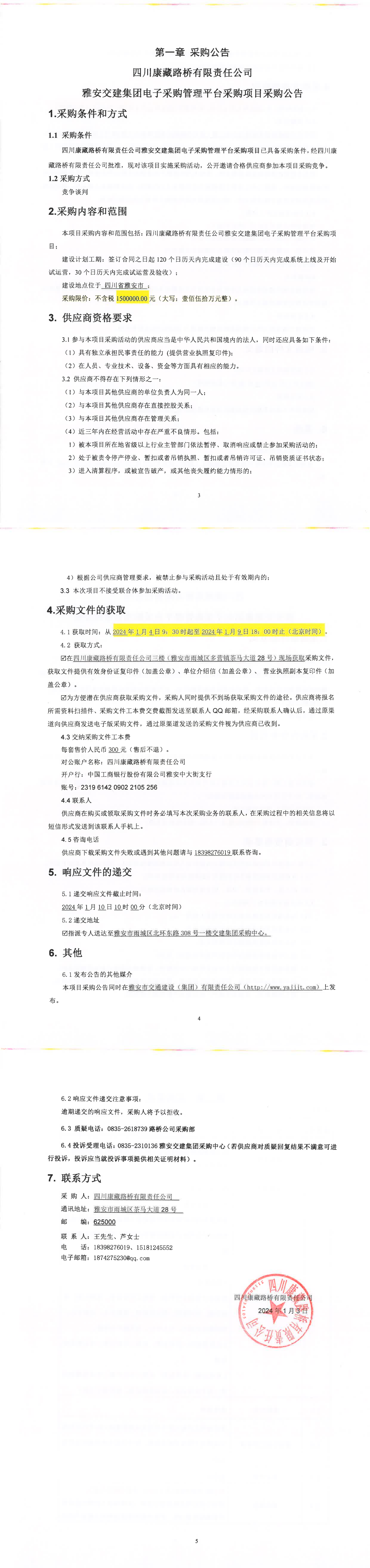 四川康藏路桥有限责任公司威廉希尔集团电子采购管理平台采购项目采购公告