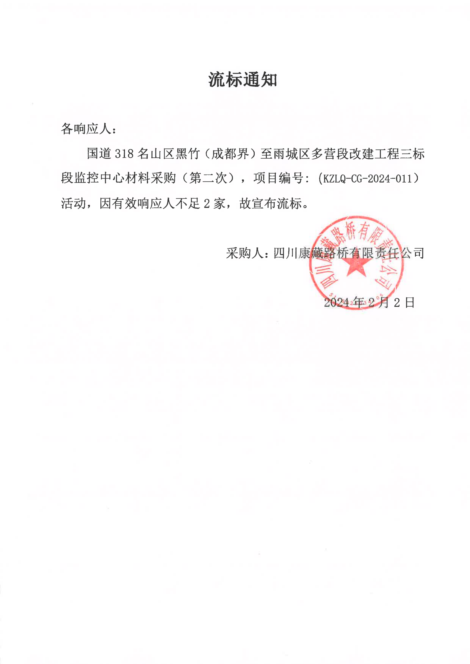 四川康藏路桥有限责任公司国道318名山区黑竹(成都界)至雨城区多营段改建工程三标段监控中心材料采购(第二次)流标通知