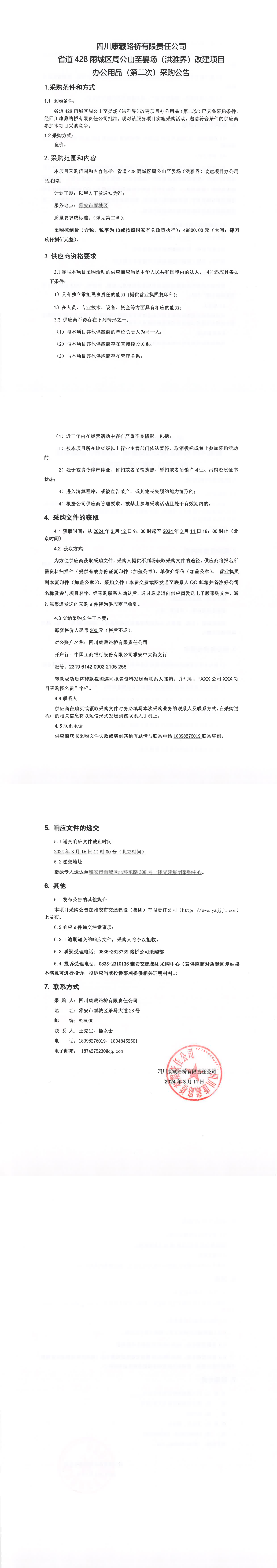 四川康藏路桥有限责任公司省道428雨城区周公山至晏场(洪雅界)改建项目办公用品(第二次)采购公告