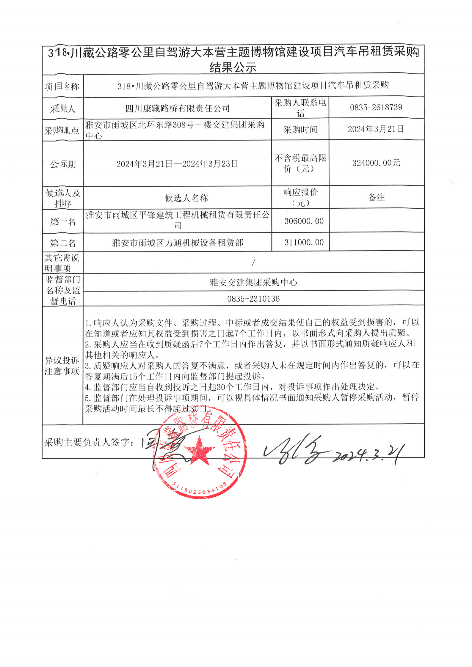 四川康藏路桥有限责任公司318·川藏公路零公里自驾游大本营主题博物馆建设项目汽车吊租赁采购结果公示