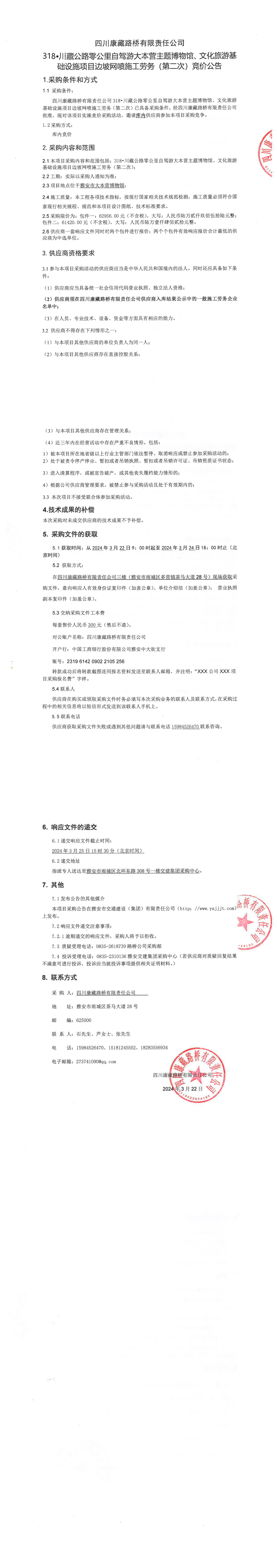 四川康藏路桥有限责任公司318·川藏公路零公里自驾游大本营主题博物馆、文化旅游基础设施项目边坡网喷施工劳务(第二次)竞价公告