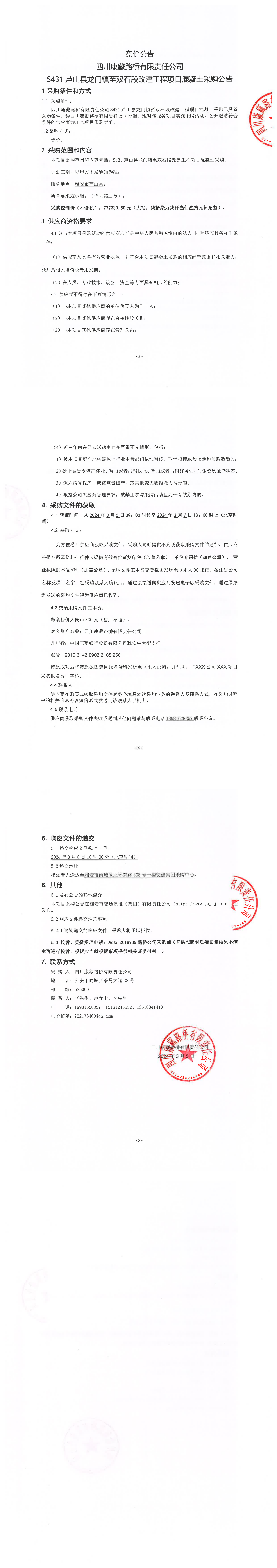 四川康藏路桥有限责任公司S431芦山县龙门镇至双石段改建工程项目混凝土采购公告