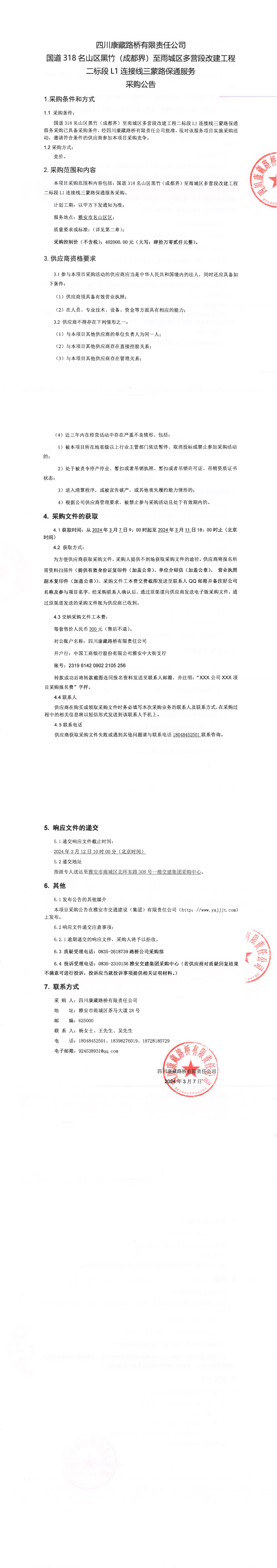 四川康藏路桥有限责任公司国道318名山区黑竹(成都界)至雨城区多营段改建工程二标段L1连接线三蒙路保通服务采购公告