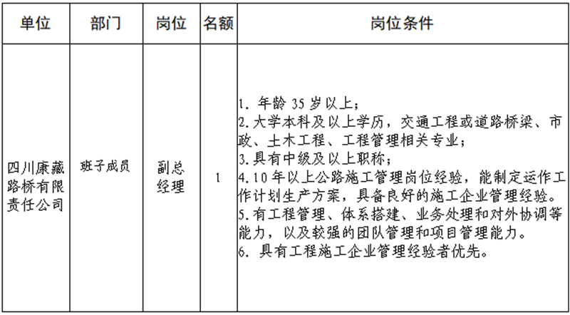 根据开展需要,决定面向社会公开招聘雅安市交通建设(集团)有限责任公司(以下简称“威廉希尔集团”)所属子公司班子成员4名,现将有关事项公告如下: