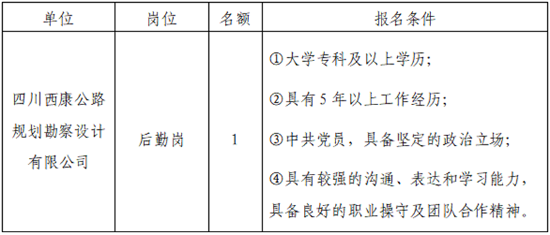 根据开展需要,决定面向社会公开招聘雅安市交通建设(集团)有限责任公司(以下简称“威廉希尔集团”)所属子公司综合办公室后勤岗1名,现将有关事项公告如下: