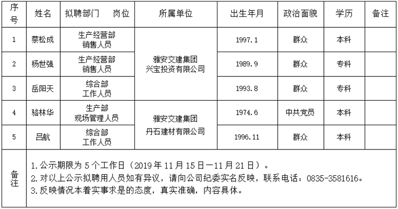 对以下拟聘用人员予以公示: