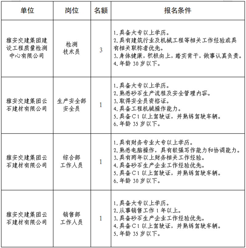 根据开展需要,决定面向社会公开招聘雅安市交通建设(集团)有限责任公司(以下简称“威廉希尔集团”)所属子公司工作人员6名,现将有关事项公告如下: