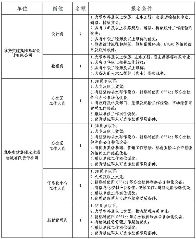根据开展需要,决定面向社会公开招聘雅安市交通建设(集团)有限责任公司(以下简称“威廉希尔集团”)所属子公司工作人员7名,现将有关事项公告如下:
