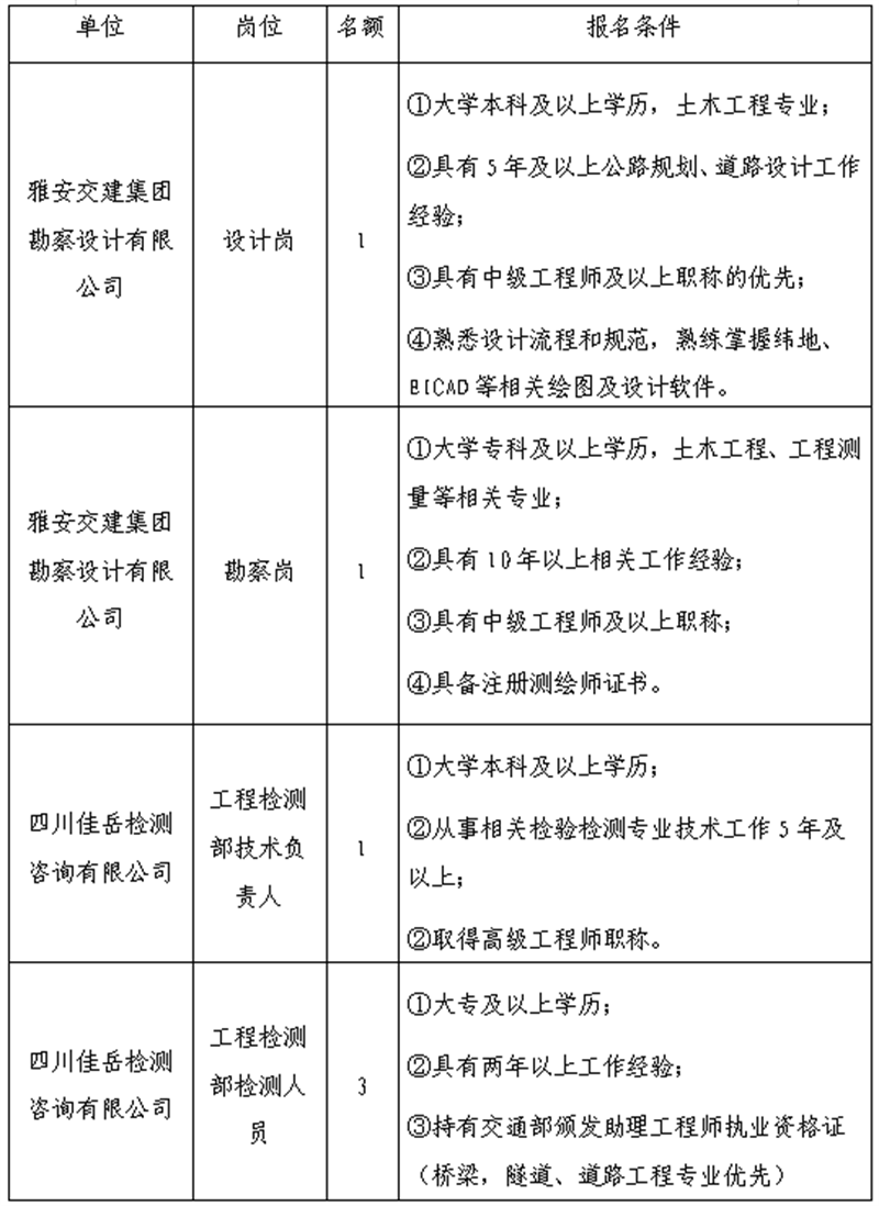 根据开展需要,决定面向社会公开招聘雅安市交通建设(集团)有限责任公司(以下简称“威廉希尔集团”)所属子公司工作人员6名,现将有关事项公告如下: