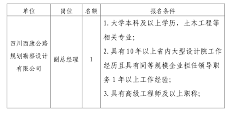 1.报名。公告发布在雅安市交通建设(集团)有限责任公司门户网站,自发布之日起即可报名,截止时间为2019年7月5日18:00。网上报名,报名者须如实填写《报名登记表》。 网上报名,在规定时间内将填写好的《报名登记表》、本人有效身份证、毕业证、职称、执业资格及工作业绩等证明材料以电子文档的形式发送至邮箱2018523008@qq.com(姓名+应聘公司名称+应聘工作岗位)。咨询电话:0835-5897859。