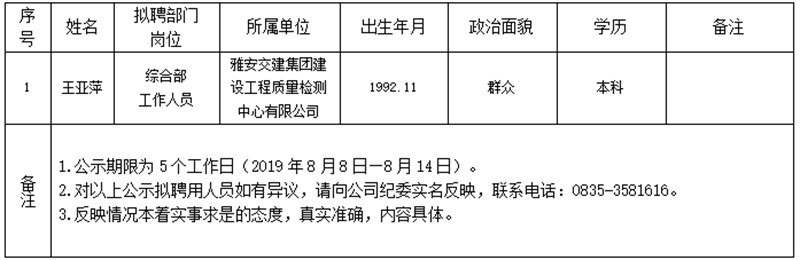 威廉希尔集团子公司拟聘用人员公示(工程质量检测中心)