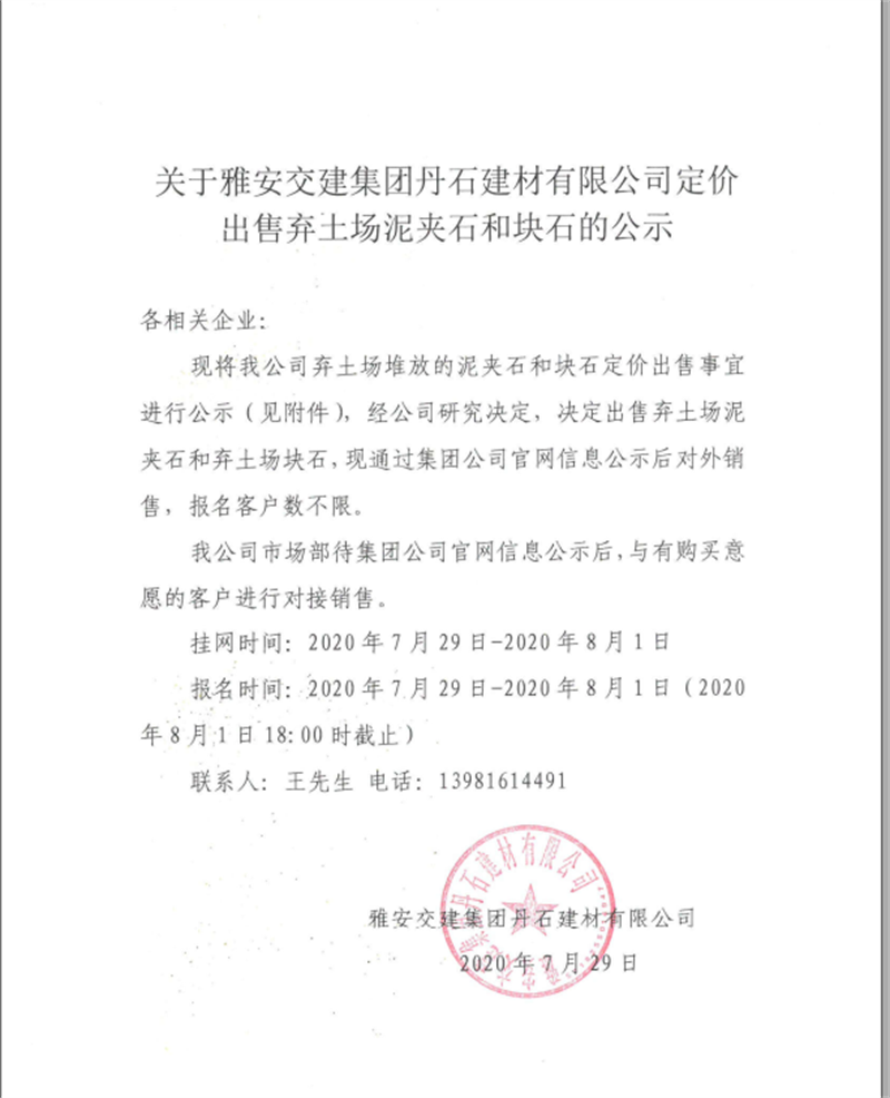 关于威廉希尔集团丹石建材有限公司定价出售弃土场泥夹石和块石的公示