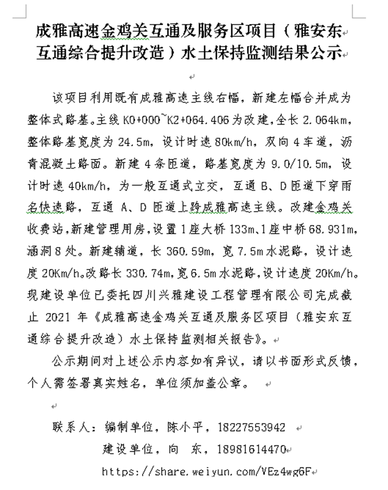成雅高速金鸡关互通及服务区项目(雨名快速通道)水土保持监测结果公示