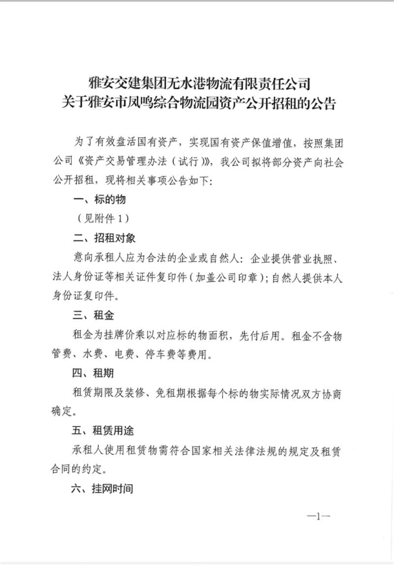 威廉希尔集团无水港物流有限责任公司关于雅安市凤鸣综合物流园资产公开招租的公告