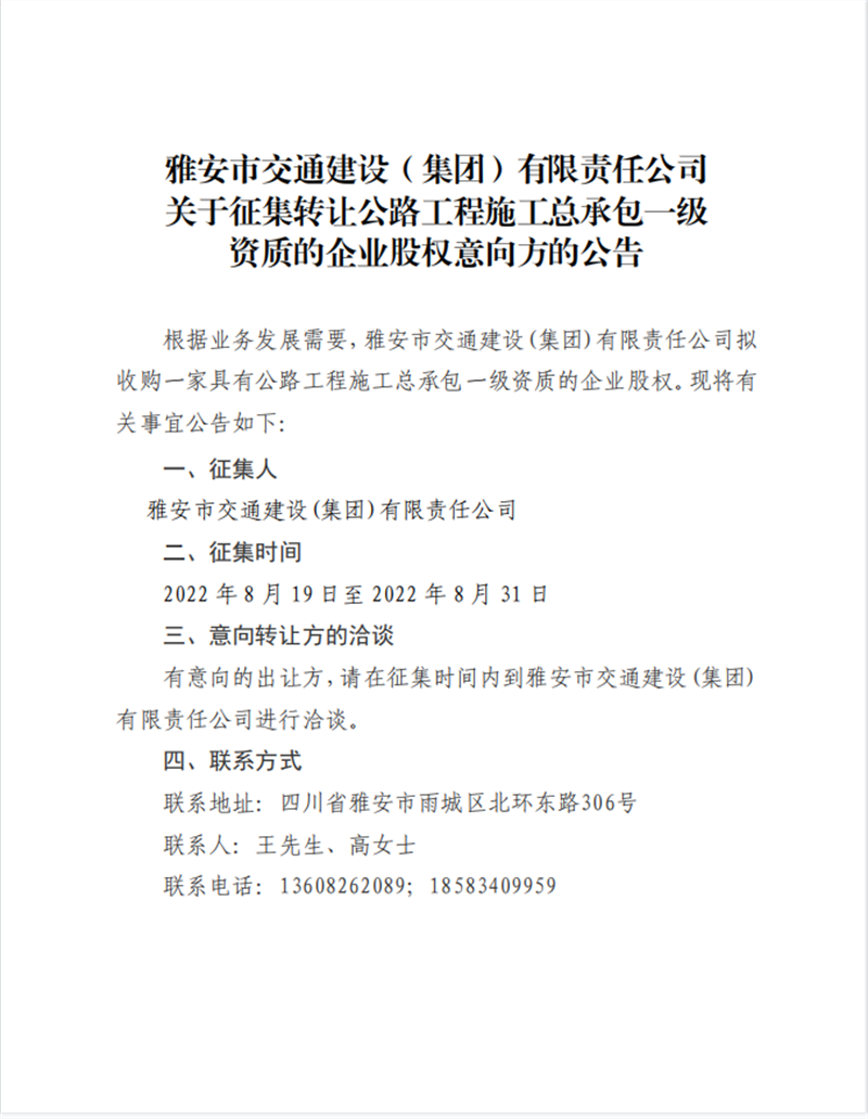 关于征集转让公路工程施工总承包一级资质的企业股权意向合作方的公告