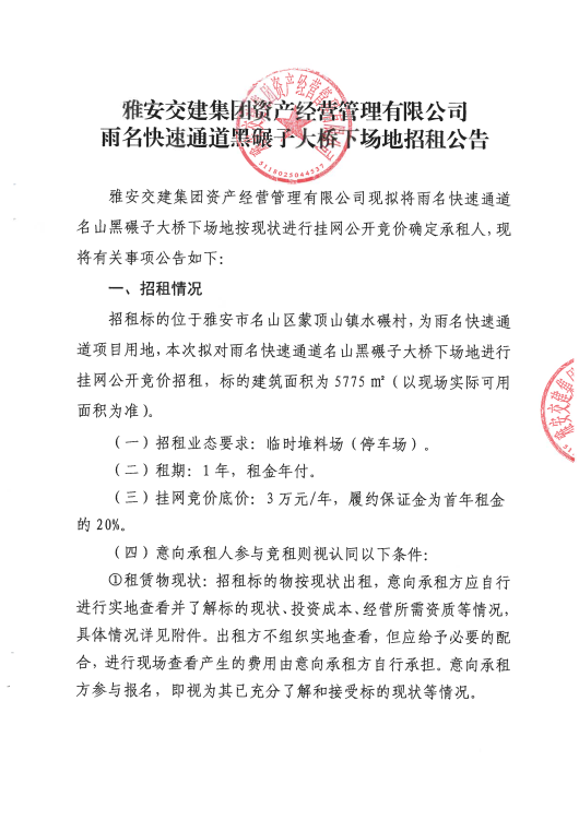 威廉希尔资产经营管理有限公司雨名快速通道黑碾子场地招租公告
