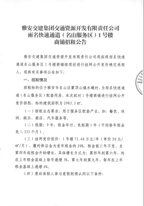 威廉希尔集团交通资源开发有限责任公司雨名快速通道名山服务区1号楼招租公告附件