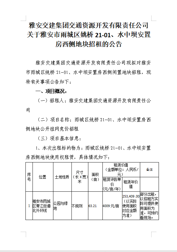 威廉希尔集团交通资源开发有限责任公司关于雅安市雨城区姚桥21-01、水中坝安置房西侧地块招租的公告
