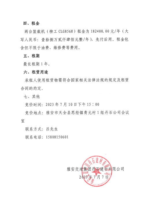 威廉希尔集团丹石建材有限公司关于2台装载机公开招租的公告附件