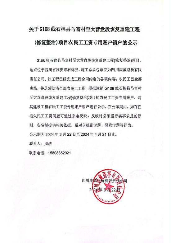 关于G108线石棉县马富村至大营盘段恢复重建工程(修复整治)项目农民工工资专用账户销户的公示