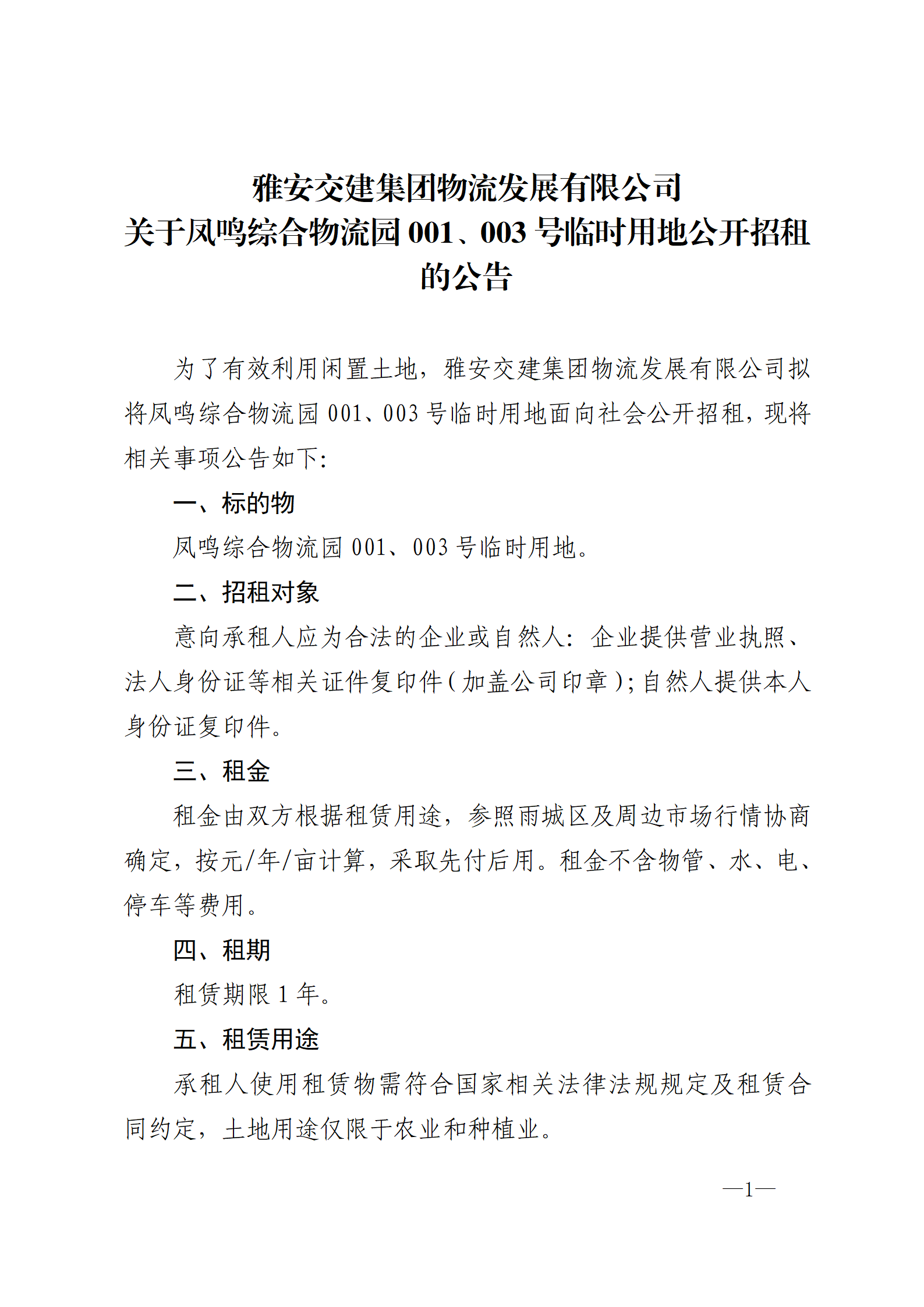 威廉希尔集团物流开展有限公司 关于凤鸣综合物流园001、003号临时用地公开招租的公告