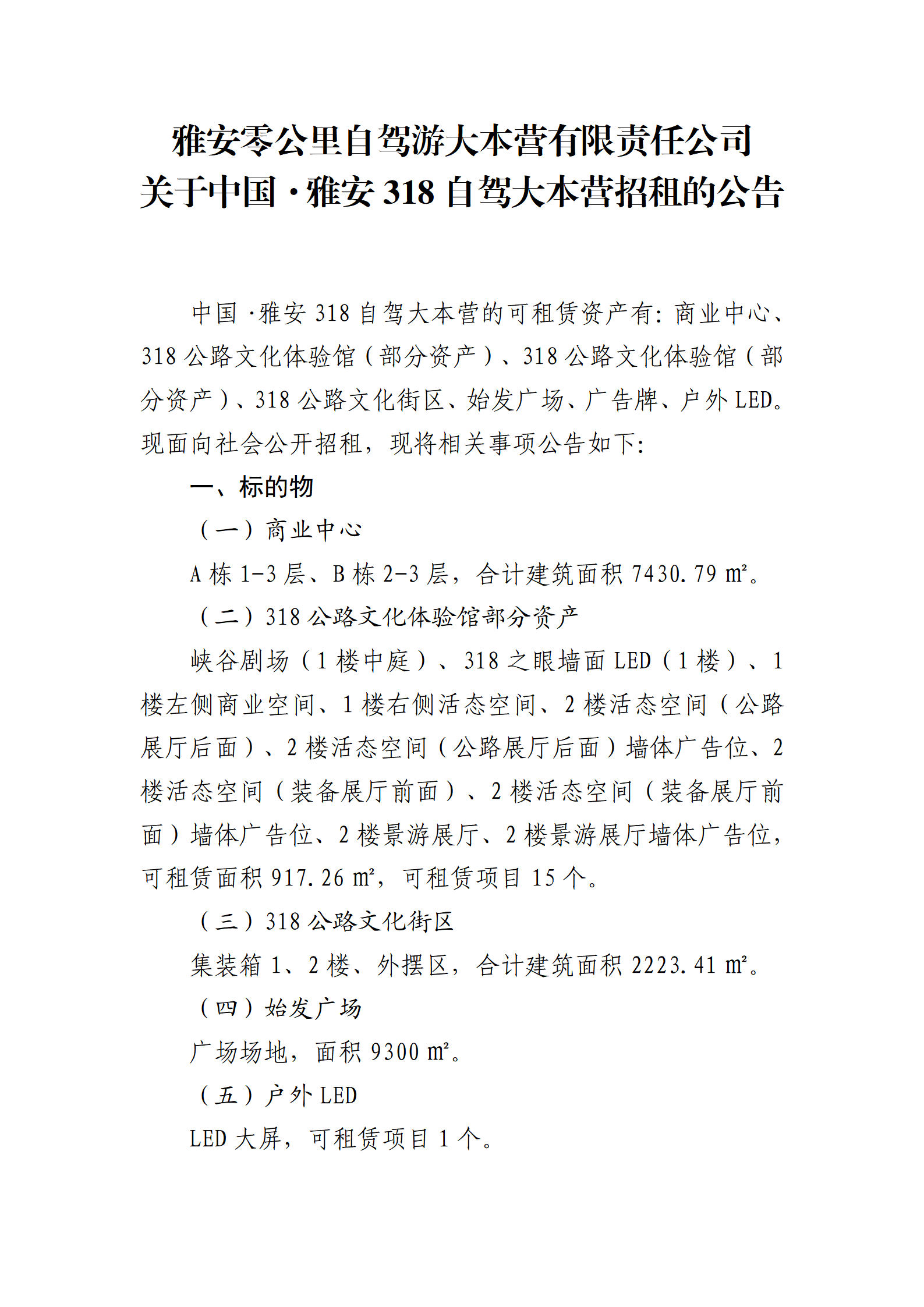 雅安零公里自驾游大本营有限责任公司 关于中国·雅安318自驾大本营招租的公告