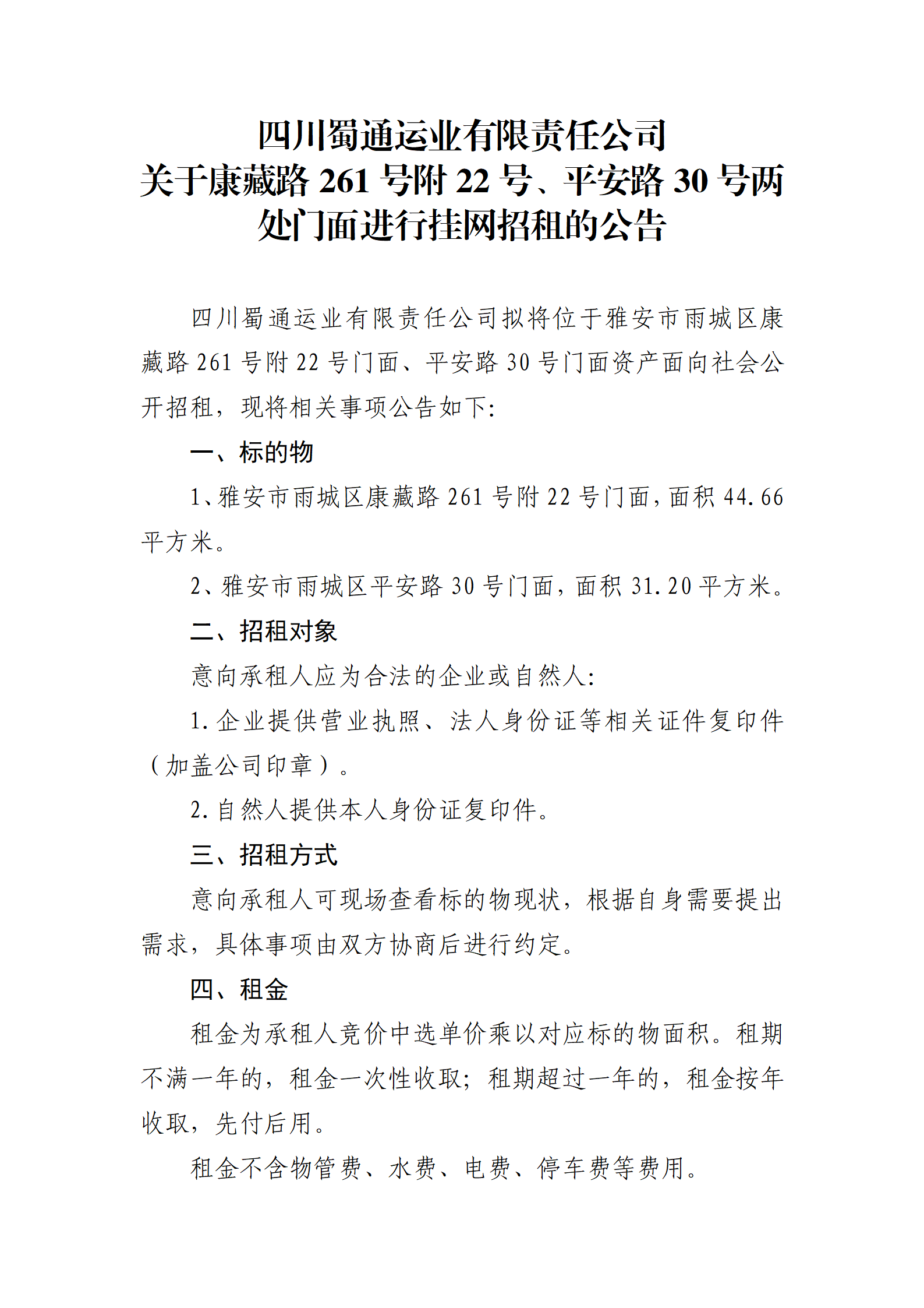 四川蜀通运业有限责任公司 关于康藏路261号附22号、平安路30号两处门面进行挂网招租的公告