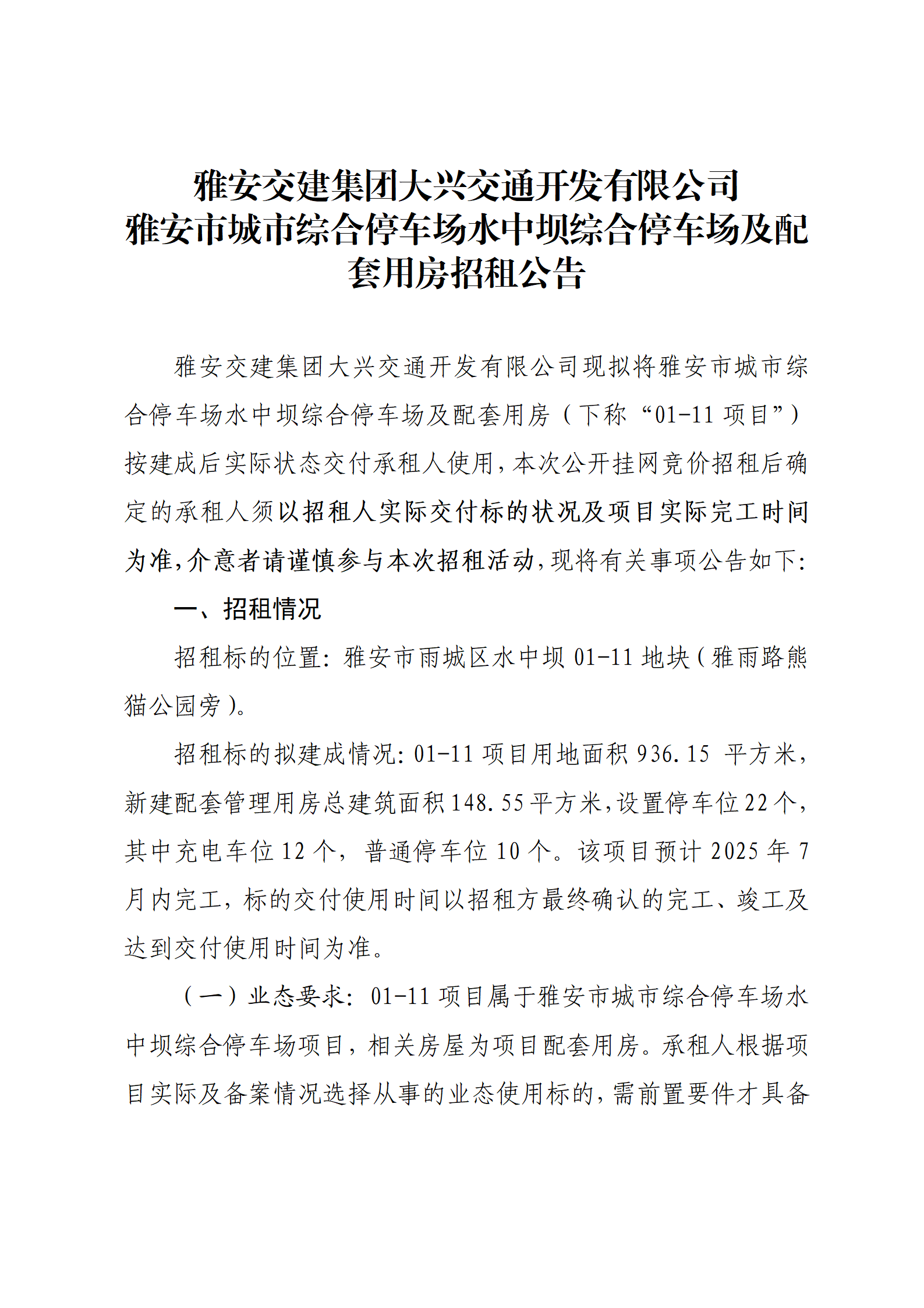 威廉希尔集团大兴交通开发有限公司 雅安市城市综合停车场水中坝综合停车场及配套用房招租公告
