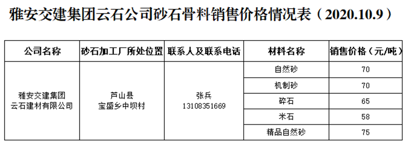 威廉希尔集团云石公司砂石骨料销售价格情况表(2020.10.9)