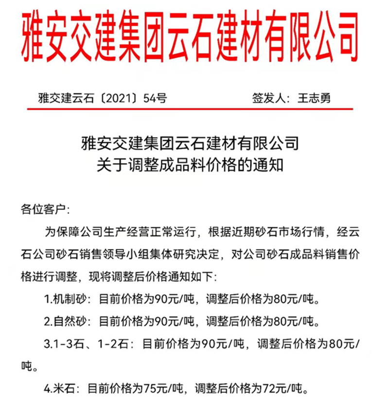 威廉希尔集团云石公司关于调整成品料销售价格的通知(2021.10.17)