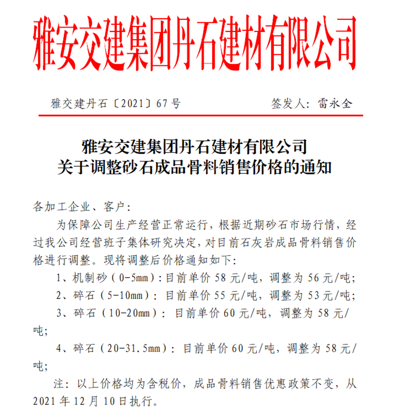 威廉希尔集团丹石公司关于调整砂石成品骨料销售价格的通知(2021.12.9)